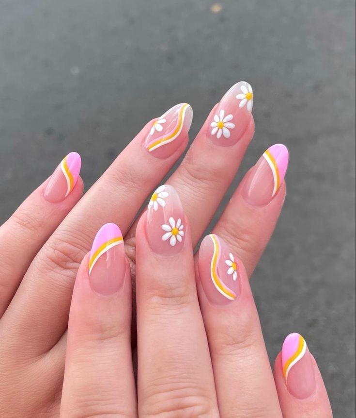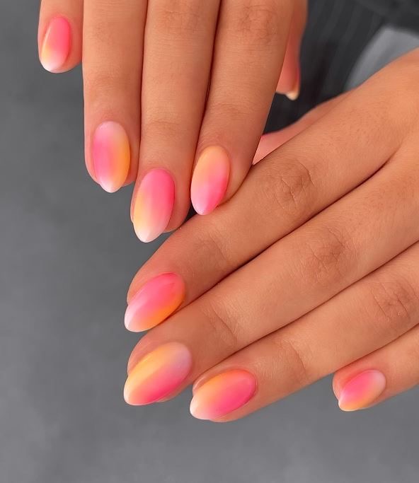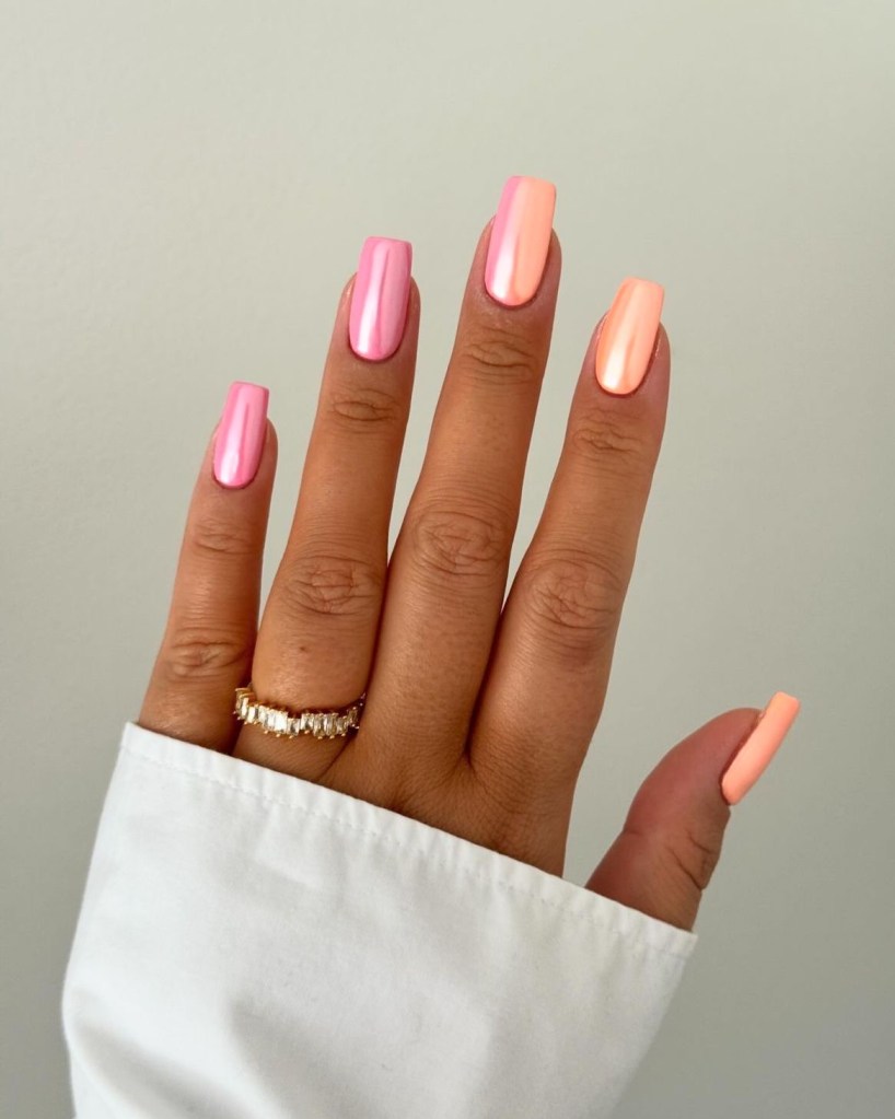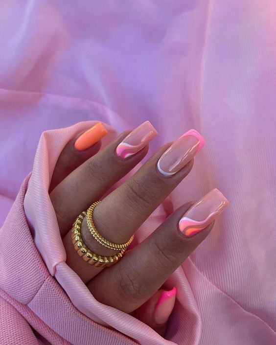 Pink and orange are complementary colors on the color wheel, meaning they enhance each other when paired together. This color combination creates a striking contrast that catches the eye and adds visual interest to your manicure, making it stand out in any summer setting.