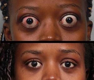 This is called Graves’ ophthalmopathy or orbitopathy or thyroid eye disease. Only about a third of people with Graves’ disease develop this condition.