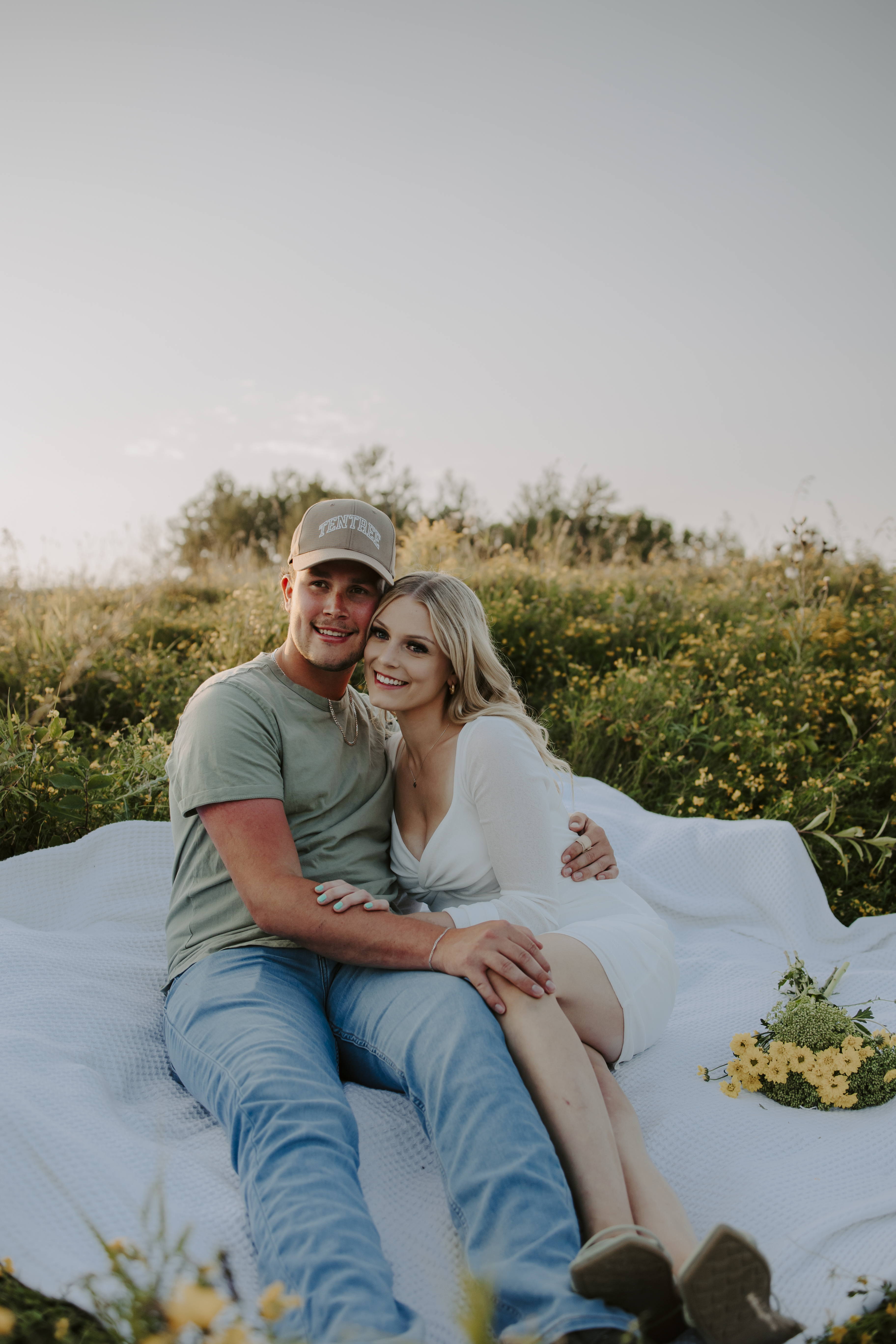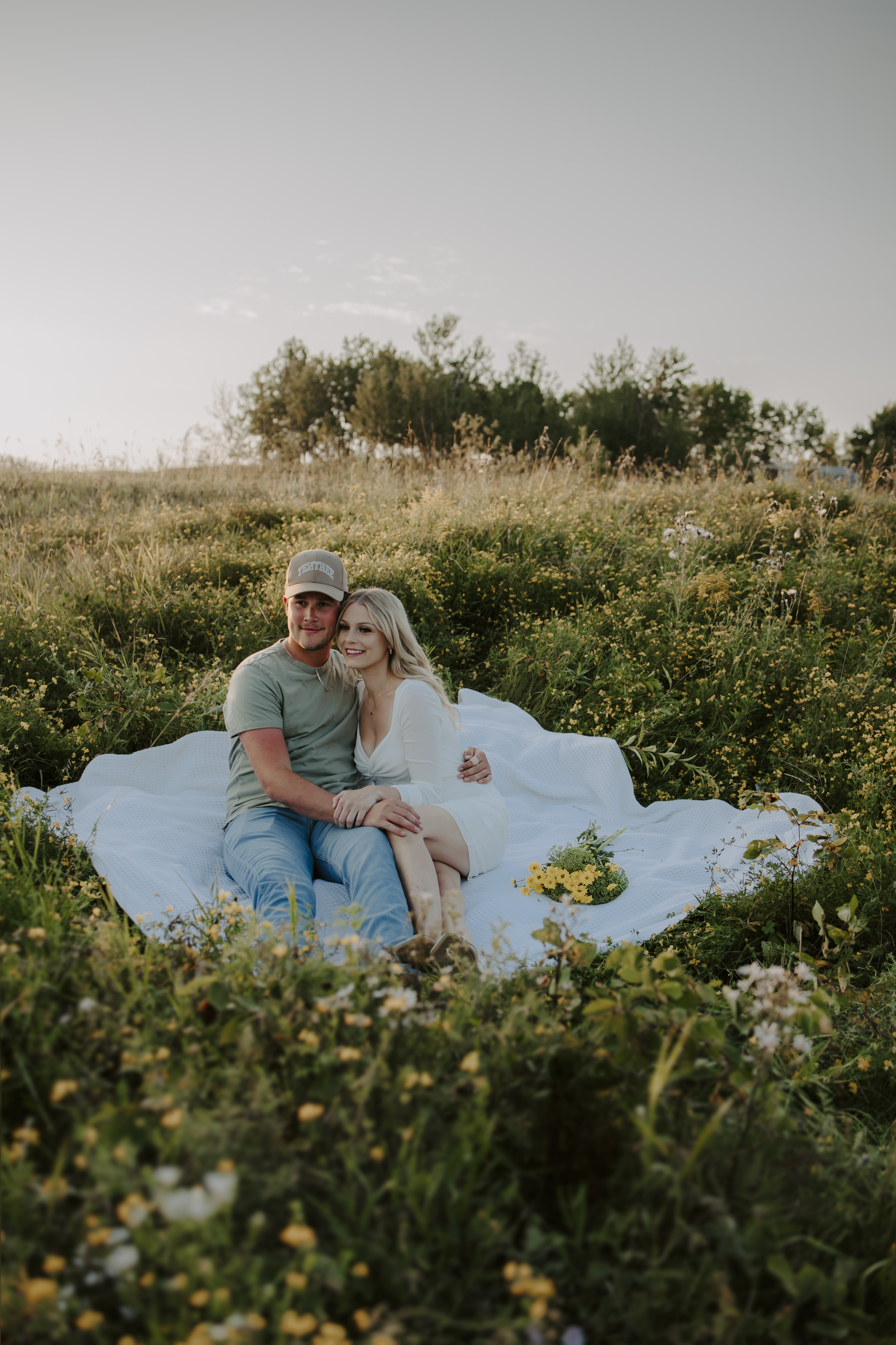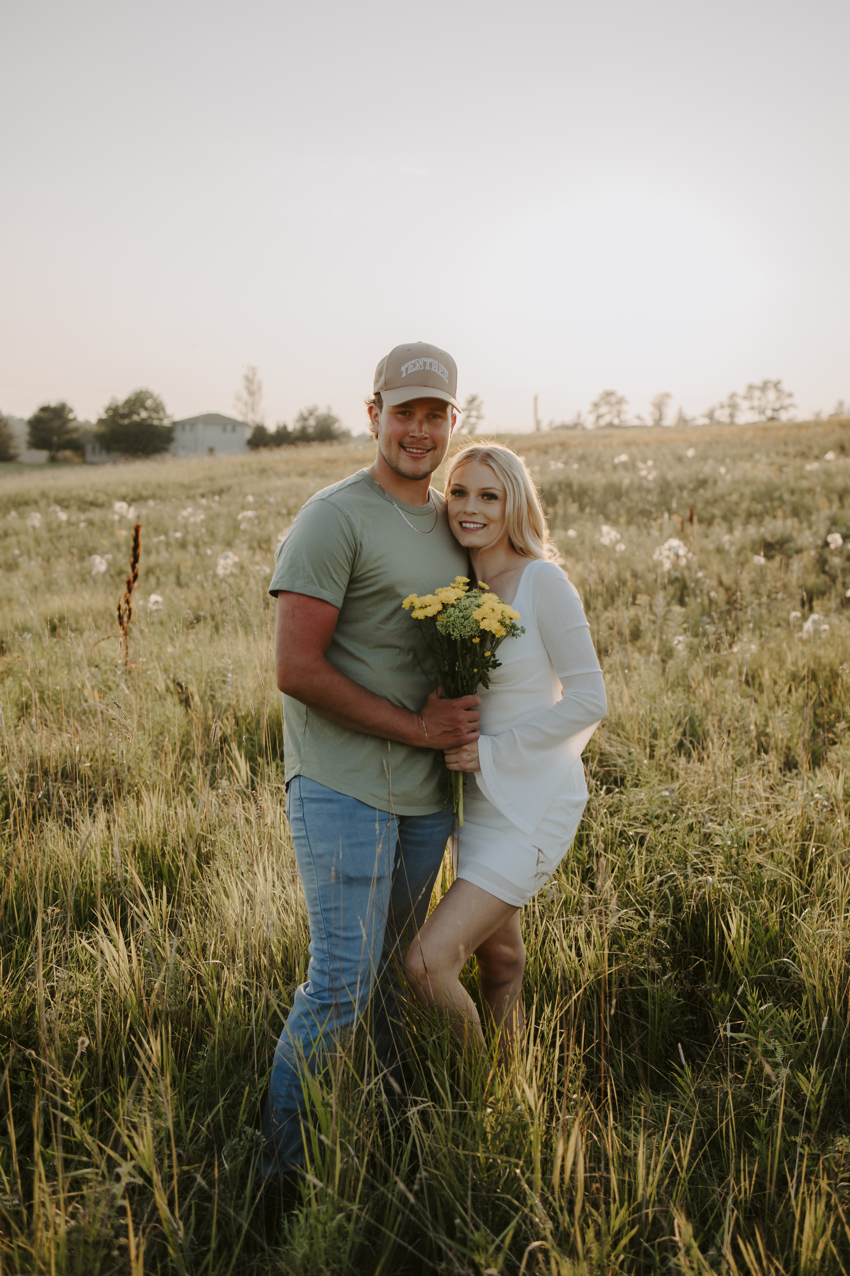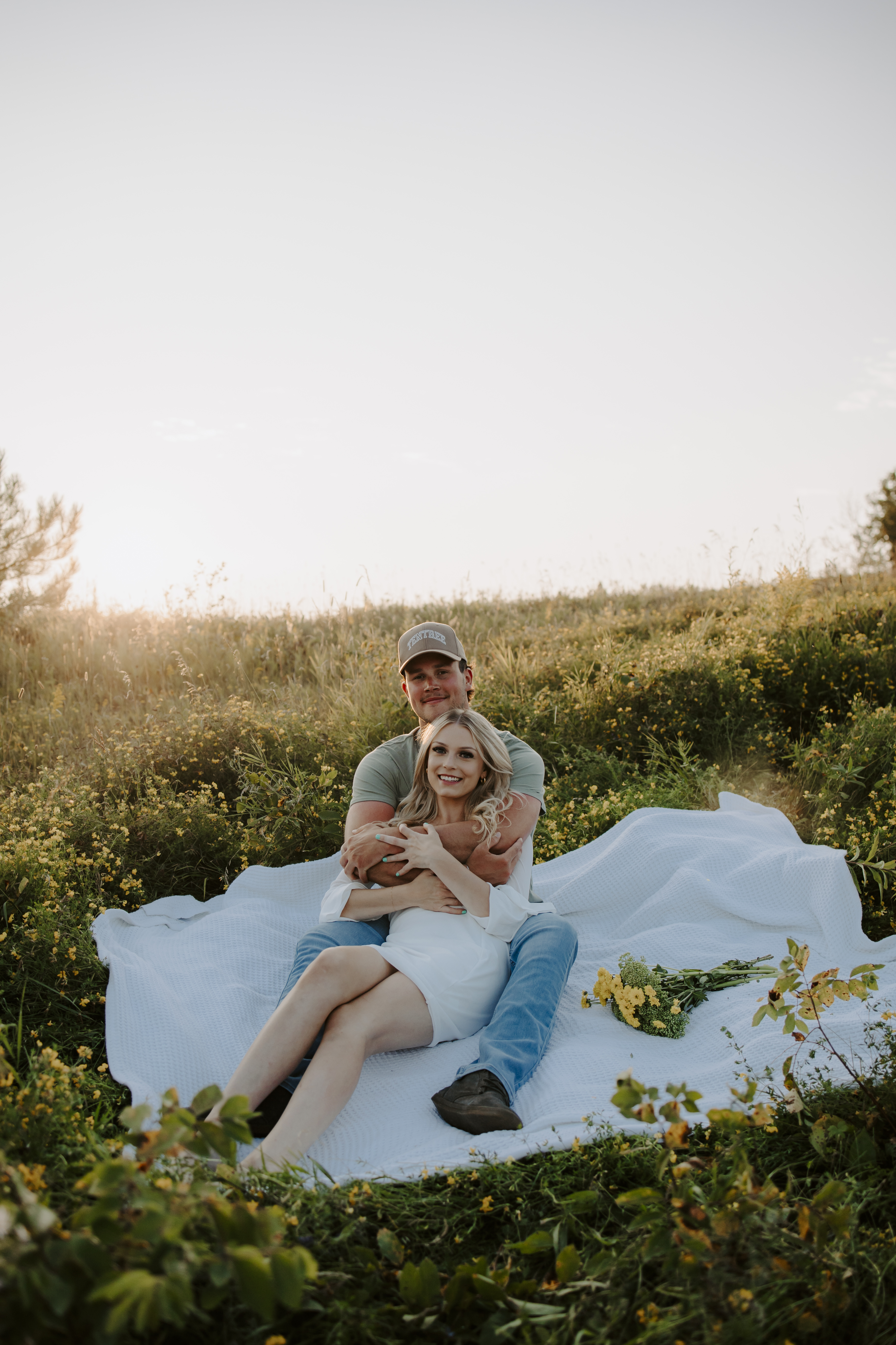 My boyfriend and I get yearly photos done and this year, I wanted our photoshoot to take place during the end of summer with our fur babies. I had chose a felid for the location of our shoot. The poses below would work for any season and in almost any location. We had brought two props with us-a $10.00 bunch of flowers and a $30.00 blanket we already had bought from Amazon. Depending the time of year/the location you’re planning on doing your shoot, have fun exploring different props that you can incorporate into your special shoot!