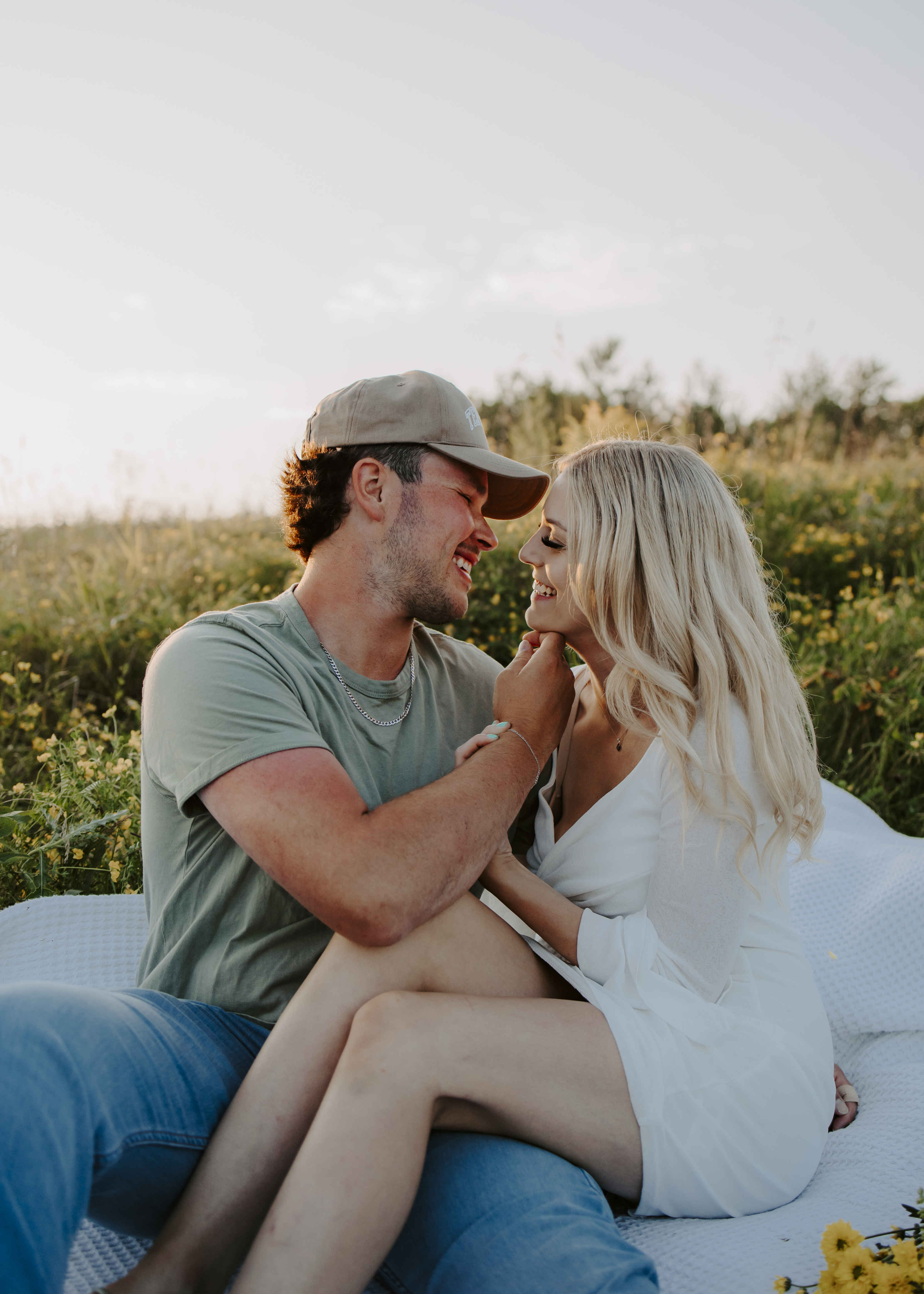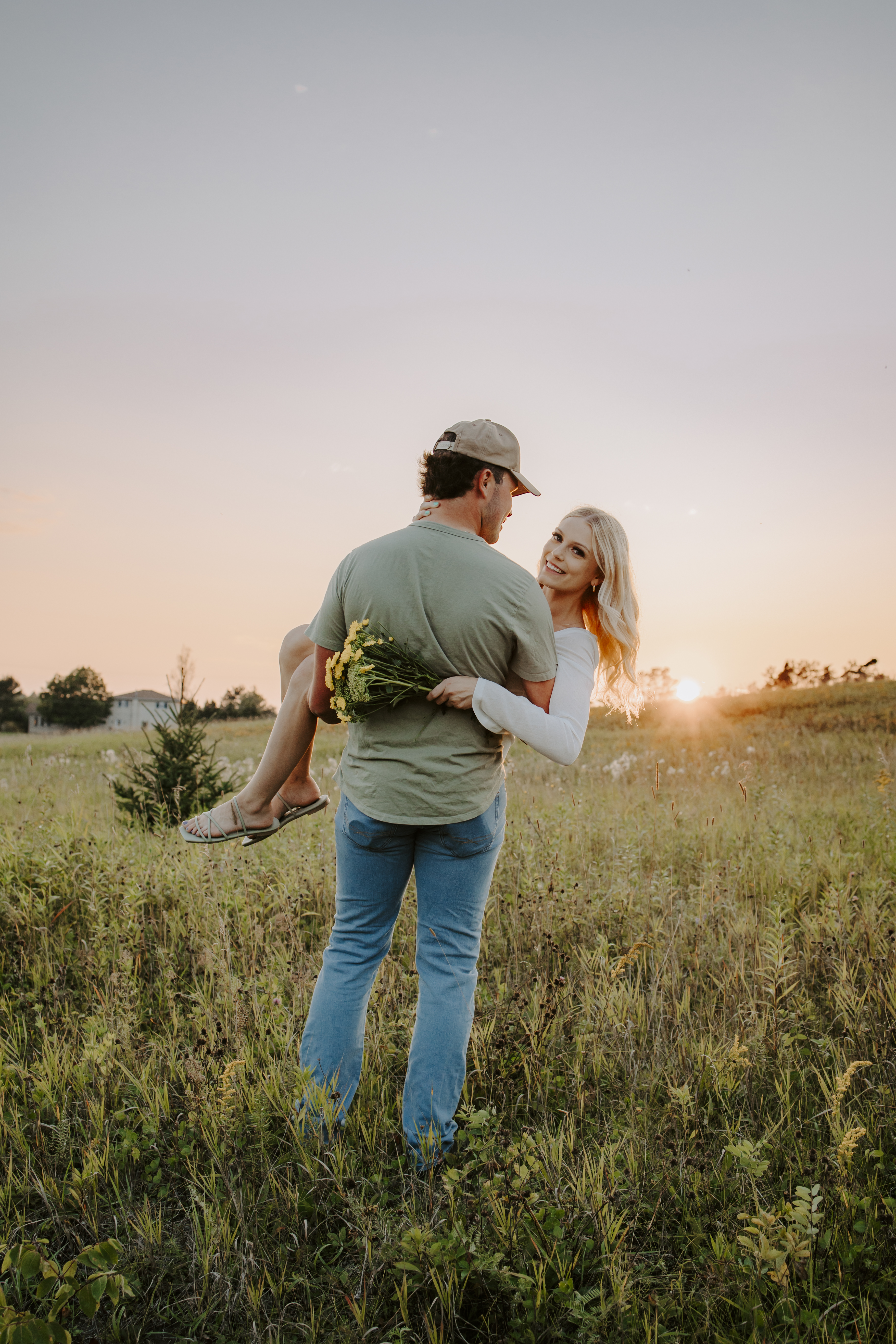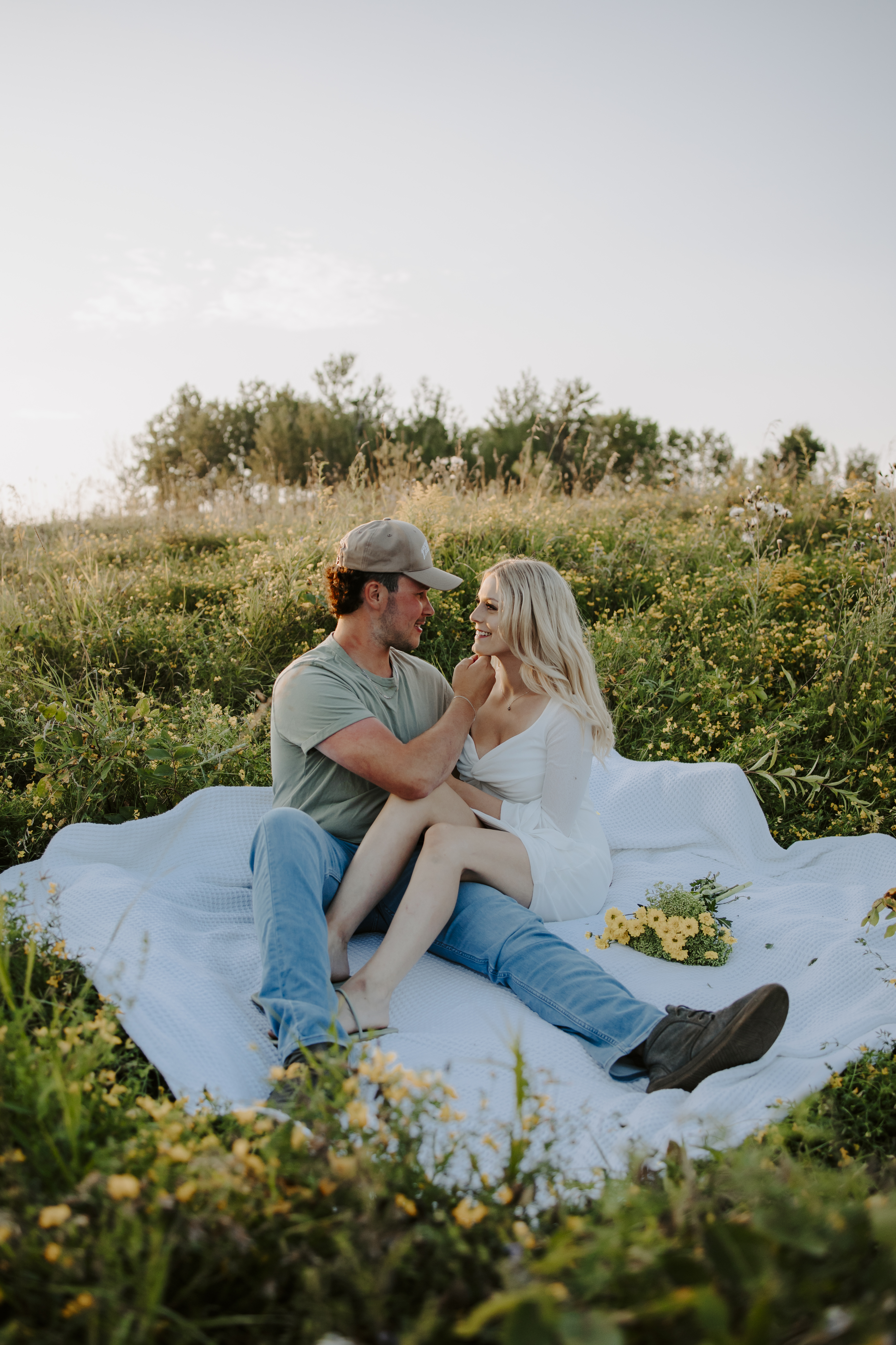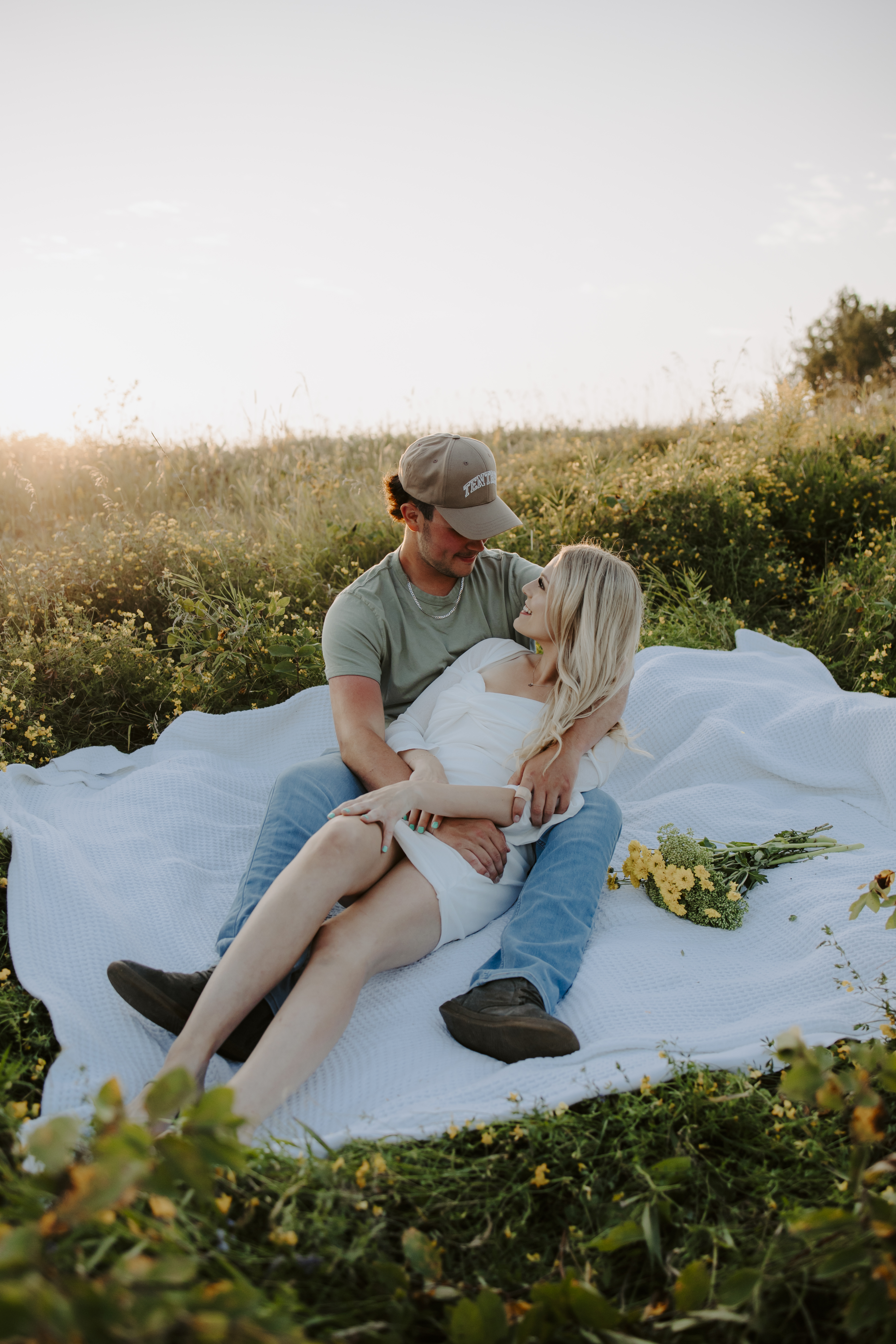 My boyfriend and I get yearly photos done and this year, I wanted our photoshoot to take place during the end of summer with our fur babies. I had chose a felid for the location of our shoot. The poses below would work for any season and in almost any location. We had brought two props with us-a $10.00 bunch of flowers and a $30.00 blanket we already had bought from Amazon. Depending the time of year/the location you’re planning on doing your shoot, have fun exploring different props that you can incorporate into your special shoot!