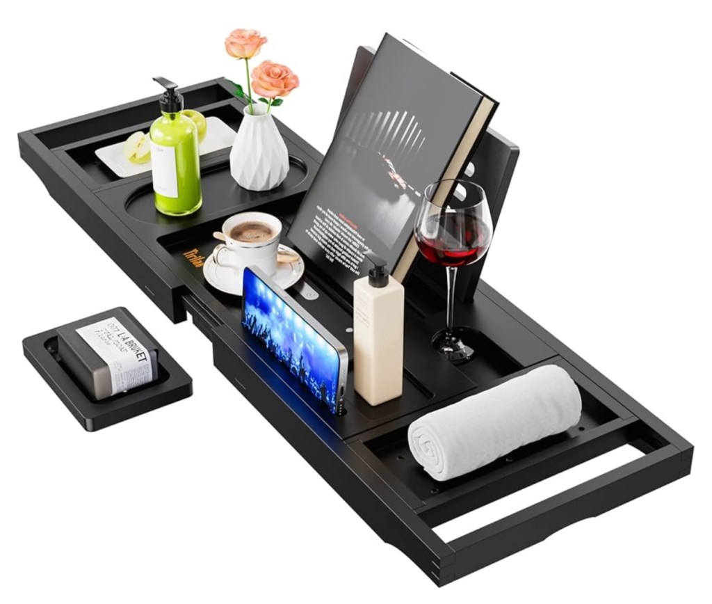 This bamboo bath tray for the bathtub is equipped with a phone, wine, candle hole, 2 removable spa trays, and tablet/book holder, also includes a free soap holder. The tray is designed to expand from 28.5″ to 41″. Imagine what an enjoyable in bathroom tray with a glass of wine, delicious snack, and favorite movie. No assembly is required! This bamboo bathtub tray is a luxurious gift!
