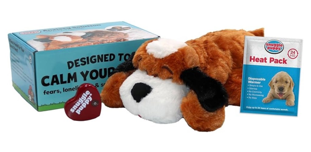 This is a cute and effective item for your new puppy! This stuffed dog toy comes with a heat pack and a heart object that stimulates the heartbeat of their mama. It’s used for anxiety relief and is a great calming aid for your pup in the early days of getting use to their new home.