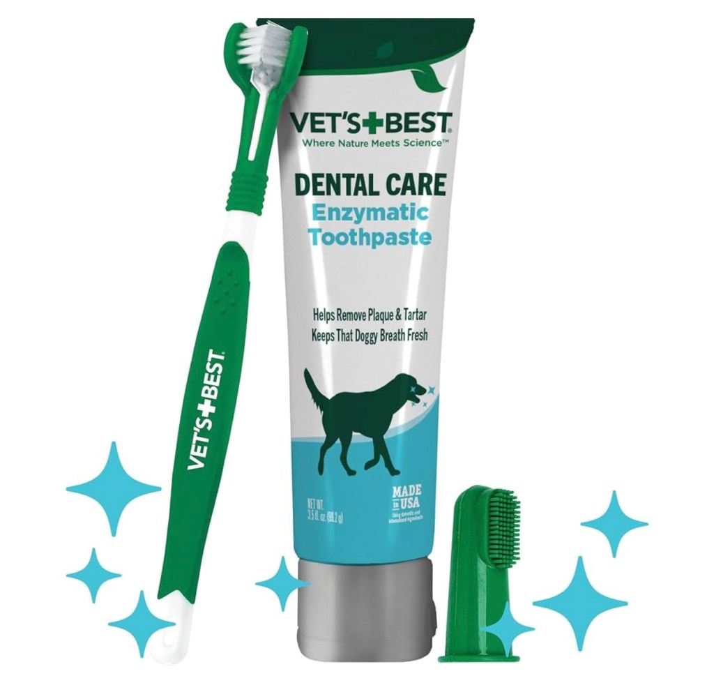 My dogs use this toothbrush and toothpaste set. It comes with a large brush to use when your dog’s adult teeth grow in and it also comes with a soft silicone finger brush that you can use to brush your puppy’s teeth. The toothpaste is made with natural ingredients, reduces plaque, whitens teeth and freshens breath.