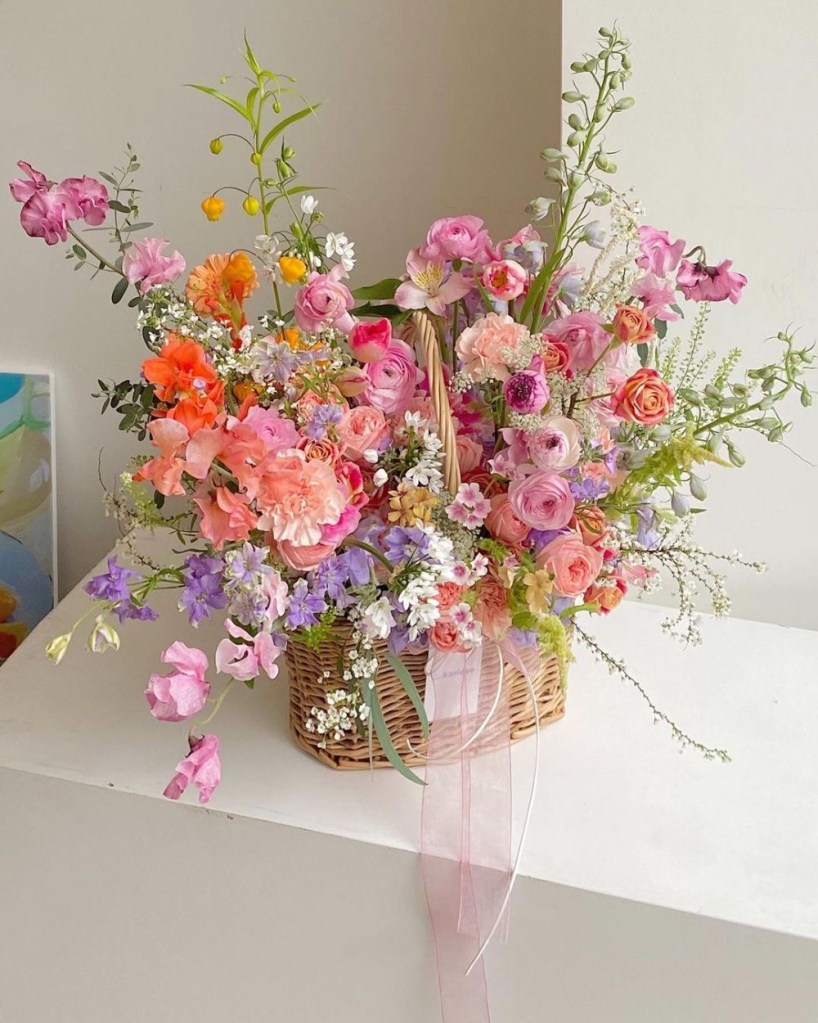 If you’re unsure where to start, you can always go for a monochromatic look, where all the flowers are in a single color or varying shades of the same hue, or a complementary color palette, like purple and yellow or pink and green, which look beautiful together.
